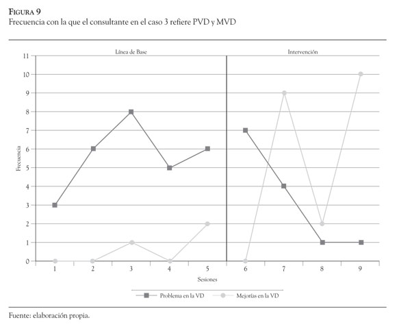 Por último, la Figura 8 permite ver los cambios en las CCR del caso 3, tras la introducción de la intervención diseñada con base en las hipótesis establecidas, a partir de la organización de la información en el modelo de formulación. Además, la Figura 9 muestra los cambios y mejorías del caso, en los contextos ajenos al de consulta observándose también cambios ellos.