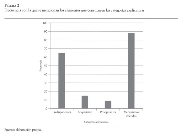 En todas las hipótesis, se hizo una descripción del problema; sin embargo, no en todos los casos se mencionaban de forma simultánea las cuatro categorías explicativas, para dar cuenta de las dificultades. Al respecto, se observó que generalmente los clínicos hacían una descripción de los mecanismos inferidos con mayor frecuencia en comparación con las otras categorías explicativas, mencionando en ocasiones de manera concurrente más de un mecanismo para el mismo consultante. En contraposición, la categoría de los factores desencadenantes/precipitantes fue la que menos se mencionó (Figura 2).
