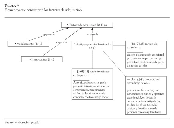 Con respecto a los factores de adquisición (Figura 4), los terapeutas hacían uso de tres tipos de elementos dentro de esta categoría: modelamiento, instrucciones y castigo de repertorios funcionales, éste último se asoció con tres de los quince verbatims de las hipótesis funcionales incluidos en las historias clínicas que fundamentaban los factores de adquisición.