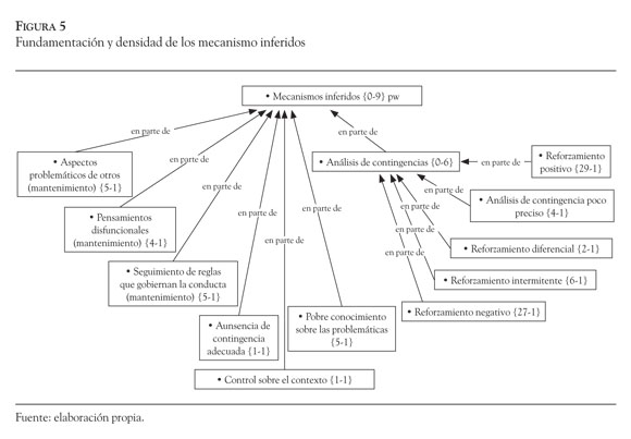 En cuanto a los mecanismos inferidos (Figura 5), se observó que los terapeutas utilizaban al menos siete tipos de elementos para explicar el mantenimiento de la problemática. El mecanismo que tenía una mayor densidad fue el análisis de contingencias {0-6} y sus subcategorías fueron las que contenían la mayor fundamentación. En contraposición, la ausencia de contingencias adecuadas y la búsqueda de control sobre el contexto por parte del consultante fueron las subcategorías con un menor peso {1-1}.