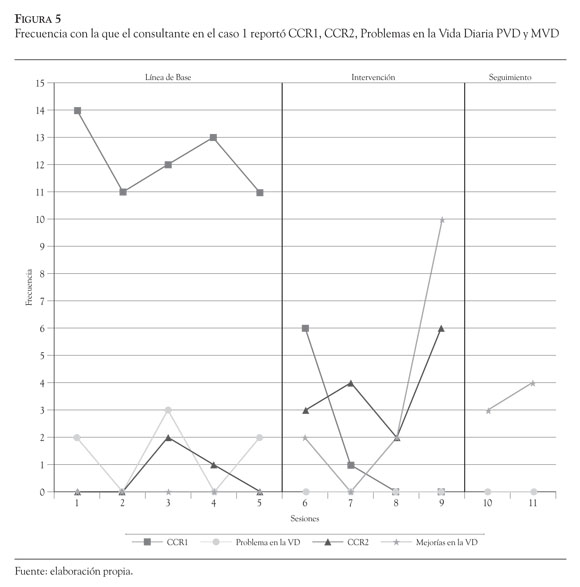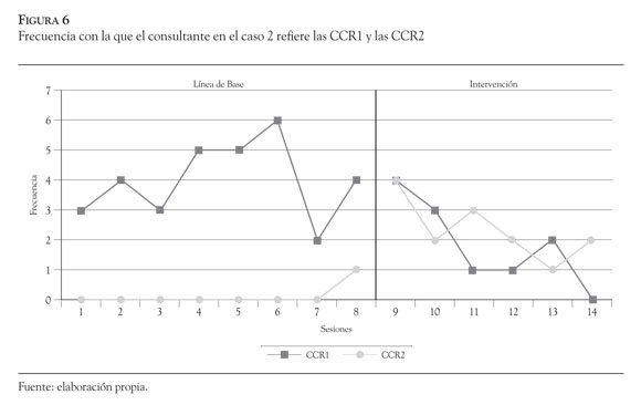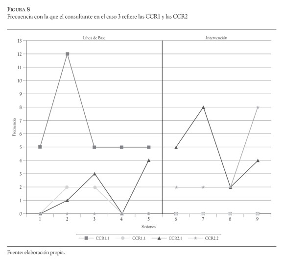 En la Figura 5, se pueden observar los cambios en el comportamiento del caso 1 tras introducir la intervención derivada de la formulación clínica, de tal forma que las CCR1 (problemas en consulta) disminuyeron su frecuencia de forma importante en dicha fase, mientras que las CCR2 (mejorías en consulta) tuvieron el efecto contrario incrementando su presentación. Cabe señalar que las sesiones 10 y 11 hacen referencia al seguimiento que se hizo un mes y tres meses, respectivamente, después de finalizar el tratamiento y permiten ver el mantenimiento de las mejorías.