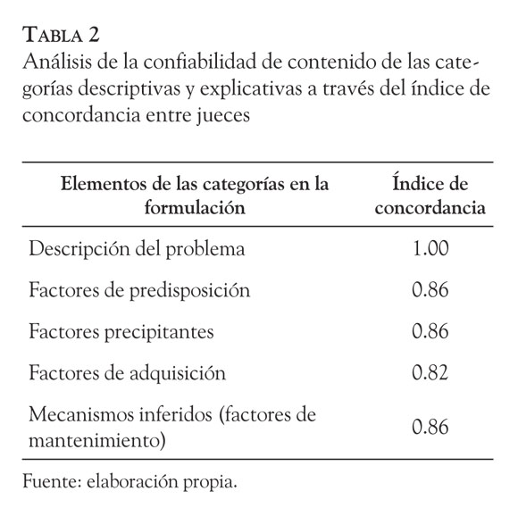 Los resultados mostraron confiabilidad de las categorías explicativas relacionadas con los factores predisponentes y los mecanismos inferidos (factores de mantenimiento) en las hipótesis y formulaciones de las historias clínicas analizadas de los años 2005 al 2008, en contraposición con los factores precipitantes y de adquisición que no mostraron confiabilidad. En cuanto a la categoría de descripción del problema no fue posible establecer el Coeficiente Kappa de Cohen, dado que para uno de los jueces éste fue un dato constante. Al respecto cabe señalar que a través del análisis cualitativo que se llevó a cabo con estos datos, se observó que las hipótesis de los factores precipitantes y de adquisición fueron mencionadas con poca frecuencia en las historias clínicas y los jueces estuvieron de acuerdo en que no se hacía mención de ellas; es posible que debido a esto no fueran confiables.