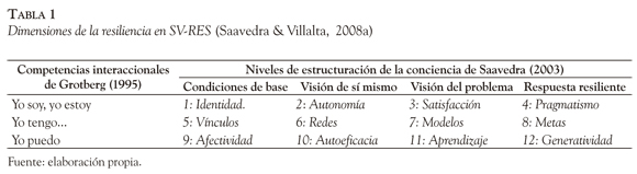 En esta dirección, la escala SV-RES (Saavedra & Villalta, 2008a) considera modalidades de interacción del sujeto: a) consigo mismo, b) con los otros y c) con sus posibilidades, en relación con acciones para aprender y transformar proactivamente sus juicios, sobre 1) la capacidad de generar metas orientadoras de la acción, 2) la capacidad para resolver una situación problemática, 3) la definición de sí mismo y 4) la definición de la historia que la constituye como tal. El articular estos modelos permite distinguir 12 dimensiones que se presentan en la siguiente tabla.