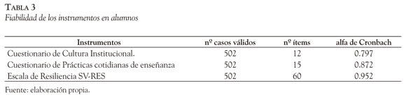 Es alta la asociación que hacen los alumnos entre la percepción de la Cultura Institucional y las Prácticas cotidianas de enseñanza (Tabla 5). Por otra parte, la correlación de ambos instrumentos con el cuestionario de Resiliencia es moderada.