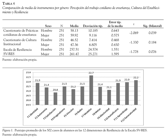 Respecto del perfil de resiliencia de los estudiantes, este refleja una gran capacidad para seguir modelos, generar respuestas alternativas frente a los problemas y aprender de las experiencias positivas y negativas. Lo anterior confirma otros estudios sobre resiliencia en estudiantes secundarios de sectores vulnerables (Saavedra & Yanquez, 2008; Villalta, 2009) y además indica un terreno fértil para que los docentes puedan fortalecer y/o promover patrones innovadores de interacción didáctica en la sala de clase.