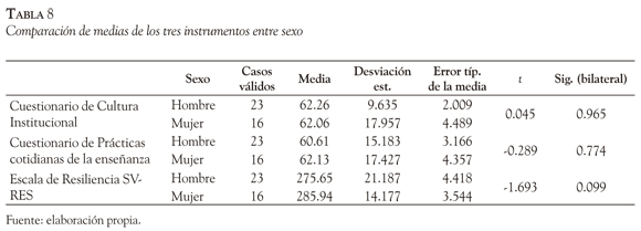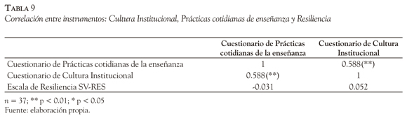 No se encuentran diferencias significativas entre las respuestas de profesores y profesoras a los tres instrumentos del estudio (Tabla 8) y la correlación entre los cuestionarios de Cultura Institucional y Prácticas cotidianas de enseñanza es moderada; y es nula la correlación entre los cuestionarios y la puntuación de la escala de Resiliencia (Tabla 9).
