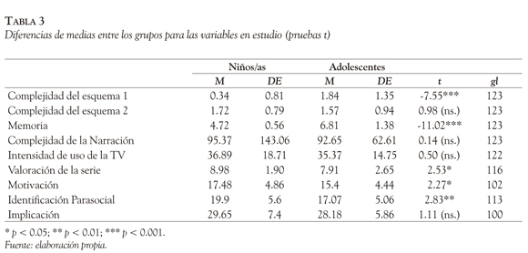 Las diferencias de media apuntan a que la complejidad de los esquemas es mayor en adolescentes que en los niños, presentando los adolescentes también un mayor empleo de la memoria declarativa. Así mismo, los niños presentan una valoración más positiva de la serie, así como una mayor motivación e identificación con los caracteres mediáticos.