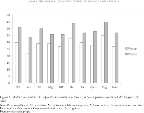 Los resultados también muestran un aumento generalizado en la edad equivalente en todos los grupos de edad, de modo que aunque los sujetos sufran graves patologías sus puntuaciones mejoran a lo largo del desarrollo, siendo superiores en el postest que en el pretest. Este resultado podría parecer evidente, si no fuera porque los niños no solo mejoran con el tiempo en las edades equivalentes, sino que además lo hacen en los cocientes de desarrollo; es decir, aunque sus puntuaciones continúen siendo patológicas, se muestran menos alejadas de la media en el postest que en el pretest. Otra evidencia de mejora es el número de niños con puntuaciones patológicas, que resulta inferior en el postest que en el pretest (por ejemplo, en la escala total, en la que se pasa de un 61 % a un 52 % de sujetos con puntuaciones de dos desviaciones típicas por debajo de la media). Las dos únicas áreas en las que no se produce esta mejora son la motora gruesa y la de comunicación expresiva, lo cual se evidenció no solo en las puntuaciones obtenidas en la prueba, sino también en las dificultades deambulatorias y del lenguaje oral de gran parte de los sujetos, que se mantuvieron a lo largo del año. Este resultado puede deberse a que la parálisis cerebral es un síndrome que cursa fundamentalmente con trastornos motores. Es decir, la función eferente por excelencia, la motora, es la que se ve más comprometida y es la que ejecuta el habla y la coordinación motora general.