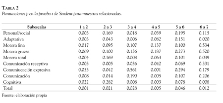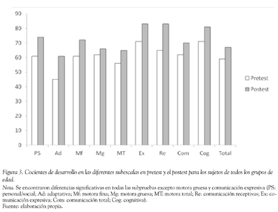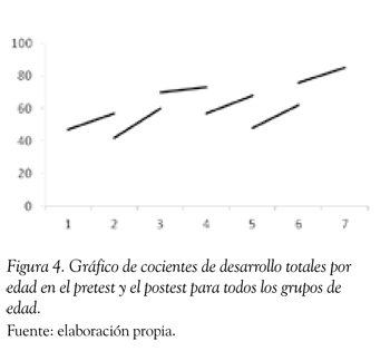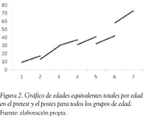 Al comparar la diferencia entre las edades equivalentes de las dos medidas en cada grupo de edad, se encontró que, como se puede apreciar en la Tabla 2, los sujetos de todos los grupos obtienen puntuaciones significativamente superiores en el postest realizado un año después, en casi todas las subpruebas del Inventario de Desarrollo de Battelle. En la Figura 2 se presentan las edades equivalentes en el pretest y el postest para la puntuación total.