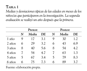 Para controlar el posible efecto cohorte, se compararon los sujetos de cada grupo de edad de la primera medición con los de la segunda (es decir, el grupo que tenía dos años en la primera medición con el de la misma edad en la segunda, y así sucesivamente con las distintas edades), sin que se encontrasen diferencias significativas para ningún grupo de edad (t de Student; todas las p > 0.078). No se encontraron diferencias significativas en función del sexo en ninguno de los dos grupos (t de Student; todas las p > 0.056), de manera que los resultados se muestran agrupados.