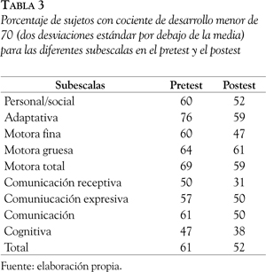 Los niños de todos los grupos obtuvieron unas puntuaciones medias inferiores a las esperadas para la muestra normal; por ejemplo, la media de los cocientes de desarrollo totales en el pretest fue de 59 y en el postest de 67, obteniendo puntuaciones similares en todos los subtest (Figura 3). Un alto porcentaje de niños obtuvo cocientes de desarrollo inferiores a 70 en diferentes áreas evaluadas (Tabla 3), siendo mayor el número de sujetos con puntuaciones inferiores a 70 en el pretest en relación con el postest en todas las subescalas. Por ejemplo, el 47 % de los niños obtuvo en el pretest una puntuación en la escala cognitiva inferior a 70, mientras que en el postest este porcentaje se redujo al 38 %. Lo mismo ocurre en la escala total, pasando de un 61 % a un 52 %.
