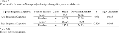 Según la prueba t para muestras independientes, no se encuentran diferencias significativas en la distribución de Intercambios de Baja Exigencia Cognitiva entre el grupo de docentes hombres y mujeres (Tabla 5). Esto confirma la segunda hipótesis de comparación.