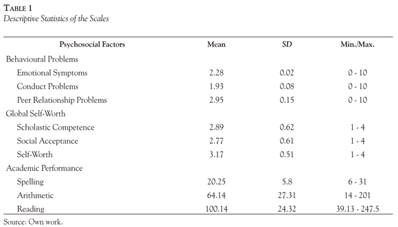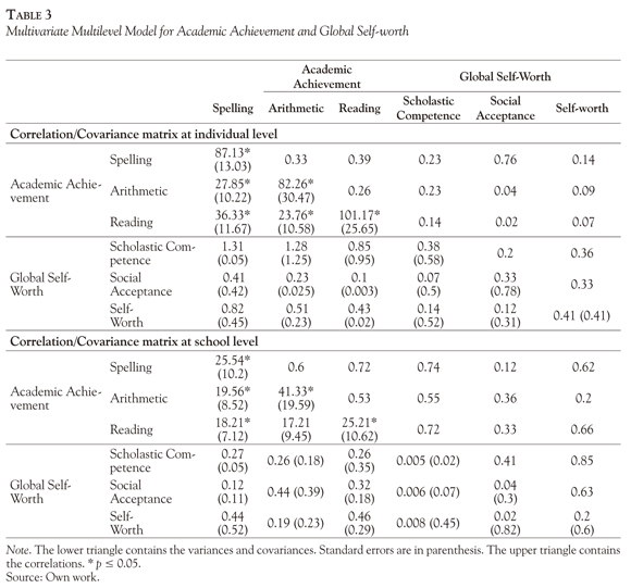 In order to counter the lack of Latin studies in this domain, we aim to investigate some psychosocial factors (behavioral problems and global self-worth) and further elaborate on their relation with academic achievement in Peruvian children from different classrooms and schools in 6th grade. Furthermore, we intend to close some gaps between the environmental factors (e.g. school) and psychosocial outcomes (behavioral problems and self-worth). Based on previous theoretical considerations and research findings, the present article addresses the following research questions: Does the academic achievement measured by spelling, reading and arithmetic is related to psychosocial functioning of children in terms of behavioral problems and global self-worth, and does this relationship differs among schools?