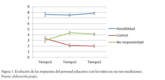 Los resultados reflejan los cambios que se van produciendo en la interacción de la díada cuidador/ niño a lo largo del tiempo, mostrando en el personal educativo que la respuesta sensible de los cuidadores de la sala cuna se mantiene en el tiempo. A su vez, la respuesta controladora disminuye significativamente al comparar la medición inicial con las dos siguientes, por lo tanto, es posible observar que con el paso del tiempo el personal educativo va disminuyendo su estilo controlador en la interacción. Por su parte, la no responsividad aumenta significativamente con el paso del tiempo, lo que se observa al comparar la primera y la segunda medición.