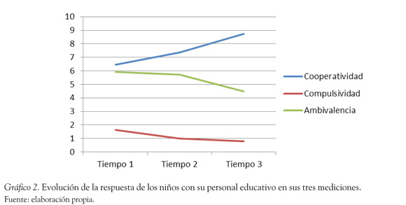 Llama la atención que la respuesta de los niños no se asocia directamente con la respuesta de los cuidadores de la sala cuna, ya que muestran un aumento significativo en sus respuestas cooperativas con el paso del tiempo, así como una disminución también significativa en sus respuestas ambivalentes y una disminución no significativa en la compulsividad. Esto quiere decir que a medida que pasa el tiempo los niños se van mostrando más cooperadores, capaces de explorar su entorno y más capaces de regular sus emociones, así como también menos ambivalentes.