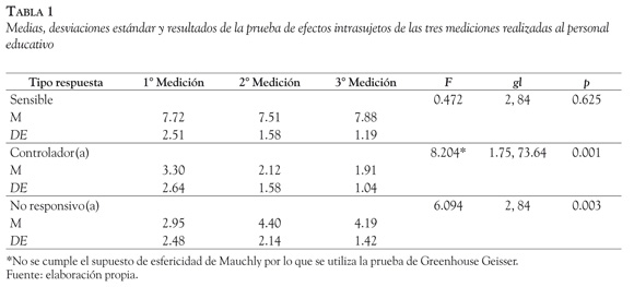 En la Tabla 1 se puede observar que las medias de la respuesta sensible del personal educativo tienden a mantenerse relativamente estables con el paso del tiempo, así como la dispersión de los resultados tiende a disminuir. Sin embargo, al cumplirse el supuesto de esfericidad W = (Sig.= 0.107), se aprecia que estas diferencias no resultan significativas (F(2 = 0.472, p = 0.625). De acuerdo a la varianza explicada 1.1 % (Eta2 parcial = 0.011), el tamaño efecto es bajo, lo que significa que estas diferencias no son importantes, así como también la potencia (0.125), lo que podría indicar un tamaño muestral insuficiente.