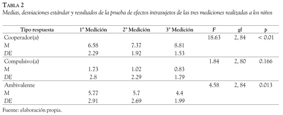 Por otro lado, también se puede observar en la tabla que las medias para la respuesta compulsiva de los niños con su personal educativo disminuyen con el paso del tiempo, así como también disminuye la dispersión en torno al promedio. Sin embargo, al cumplirse el supuesto de esfericidad W (Sig.= 0.553), estas diferencias no resultan significativas (F(2, 80) = 1.84, p = 0.166), con un tamaño efecto bajo de acuerdo a la varianza explicada 4.4 % (Eta2 parcial = 0.044), lo que indicaría que las diferencias no resultan importantes.