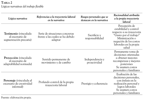 Sobre esa base, el segundo estudio buscó comprender las subjetividades que desarrollan los sujetos que trabajan en esos diferentes escenarios, a partir del análisis de las narrativas de los trabajadores que se desenvuelven en esos escenarios acerca de sus propias trayectorias laborales. Este análisis se centró en las formas en que se estructuran los procesos de construcción identitaria en el trabajo, poniendo especial atención al trabajo que hacen los sujetos por atribuir sentido y continuidad a su propia experiencia (Gaete & Soto, 2012). Se identificaron tres lógicas narrativas, cada una muy vinculada a los tres escenarios flexibles antes descritos.