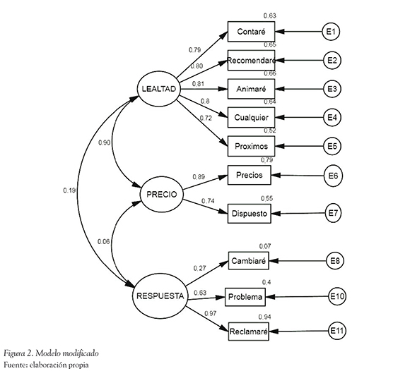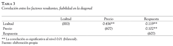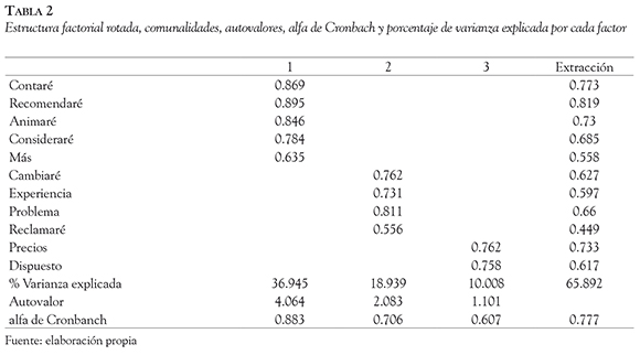 Para conocer la estructura factorial de la escala se realizó un análisis factorial exploratorio (AFE) sobre los 11 ítems resultantes, por el método de extracción de componentes principales y posterior rotación VARIMAX. Previo al análisis, se calculó la medida de adecuación muestral de Kaiser-Meyer-Olkin (KMO) y el test de esfericidad de Bartlett. El índice KMO mostró un valor de 0.82 y el test de Bartlett resultó estadísticamente significativo (%^5 = 7275.632; p < 0.001), lo que llevó a concluir que la aplicación del análisis factorial resultaba pertinente. La estructura dimensional resultante está conformada por tres factores (lealtad, sensibilidad al precio y respuesta) que conjuntamente explican un 65.89% de la varianza (Tabla 2).