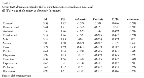 El objetivo de este artículo fue el de adaptar y validar la escala de Zeithaml et al. (1996) de Intenciones Futuras de Comportamiento en usuarios de servicios deportivos, traducida al español por Setó (2003). En primer lugar, se procedió al análisis cuantitativo de los ítems. Este tratamiento tiene como fin garantizar que tengan la capacidad de poner de manifiesto las diferencias existentes entre los individuos. Por ello, el objetivo es conseguir un grupo de ítems que maximice la varianza del test, seleccionando aquellos con un elevado poder de discriminación, alta desviación típica, y con puntuaciones medias de respuesta situadas en torno al punto medio de la escala (Bollen & Long, 1993; Carretero-Dios & Pérez, 2005; Nunnally & Bernstein, 1995).