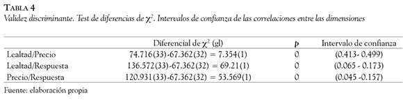 Actualmente, se utiliza una versión modificada del procedimiento anterior. Se trata de estimar modelos alternativos y realizar con cada uno un test de diferencias de ji cuadrado. En la Tabla 4 se comprueba como la diferencia entre los ji cuadrado fue siempre significativa, por lo que las dimensiones de la escala de intenciones futuras de comportamiento de usuarios de servicios deportivos fueron significativamente diferentes entre sí, corroborando la validez discriminante.