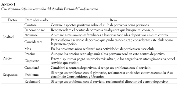 El instrumento utilizado fue la Escala de Intenciones de Comportamiento de Zeithaml et al. (1996), traducida y adaptada a servicios turísticos por Setó (2003). Se trata de una batería de 13 ítems utilizada para poder medir un amplio rango de intenciones de comportamiento. Los autores, tras un análisis factorial exploratorio obtuvieron como resultado la existencia de cinco dimensiones a partir de los trece ítems: Fidelidad, Disposición al Cambio, Sensibilidad al Precio y Comportamiento de Queja en su vertiente Interna y Externa. La escala oscilaba entre 1 (nada probable) y 7 (totalmente probable). En el cuestionario adaptado por Setó (2003), se procedió a sustituir las expresiones agencias y servicios turísticos por organizaciones deportivas y/o servicios deportivos, obteniéndose de esta forma la escala resultante.