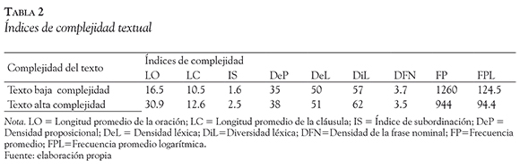 Palabras clave: comprensión lectora; lecturabilidad; índices de complejidad textual; rendimiento lector