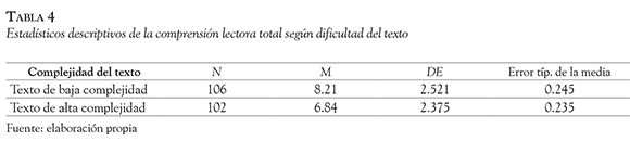 Los datos permiten afirmar que la complejidad del texto genera un efecto en la comprensión lectora global de los escolares (F(1,204) = 15.82; p = 0.0001). Estas diferencias en el rendimiento lector global dependen de esta variable con independencia del tipo de establecimiento educacional, sin que se observe una interacción entre ambos factores. Específicamente, se obtiene como resultado que el texto de alta complejidad fue más difícil de comprender para los estudiantes que el texto de baja complejidad textual, en el cual logran un mejor rendimiento global en la prueba de comprensión (t = 4.014; p = 0.001) como se muestra en la Tabla 4.
