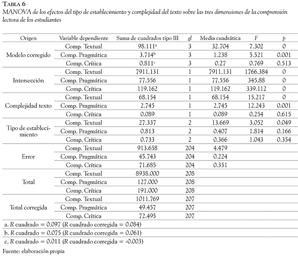 Con el propósito de estudiar el efecto de los factores complejidad del texto y tipo de establecimiento en la comprensión textual, comprensión pragmática y comprensión crítica, se realizó un diseño multivariado de la varianza (MANOVA), cuyo resultado confirmó la ausencia de interacción entre estos factores (Lamdda de Wilks = 1.112; p = 0.354), lo que permitió construir un modelo considerando solo los efectos principales. Los datos muestran que tanto la comprensión textual (F(3,204) = 7.302; p = 0.0001) como la comprensión pragmática (F(3,204) = 5.521; p = 0.001) presentan variaciones atribuibles principalmente a la complejidad del texto al cual fueron expuestos los participantes, con cierto efecto del tipo de establecimiento sobre la comprensión textual (F(2,204) = 3.052; p = 0.049). No obstante, no se observa un efecto sobre la comprensión crítica atribuible a la complejidad del texto o al tipo de establecimiento educacional (F(3,204) = 0.769; p = 0.513), como se aprecia en la Tabla 6.