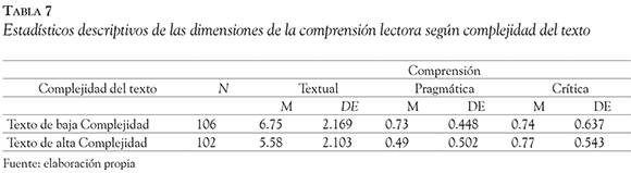 Con claridad, los datos evidencian que la alta complejidad del texto produce una disminución de la comprensión textual y la comprensión pragmática; ningún efecto se aprecia, en cambio, sobre la comprensión crítica, donde se obtienen rendimientos similares y muy bajos, pese a la diferencia de complejidad del texto, como se aprecia en la Tabla 7.