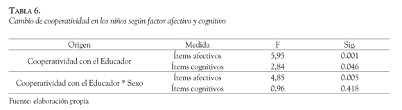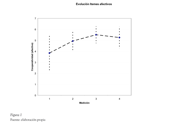 Analizando cada uno de los ítems que componen el factor cooperatividad en específico, se muestra que el cambio en el tiempo se da en forma significativa tanto para los ítems afectivos (F(3,57) =5.95, p=0.001) como en los cognitivos (F(3,57)=2.84, p=0.046). El cambio observado es de tipo lineal tanto para los ítems afectivos (F(1,19) =7.51, p=0.013), como cognitivos (F(1,19) =7.50, p=0.013). La interacción entre el factor cooperatividad y la variable sexo, si bien en términos globales no muestra efectos significativos (λ de Wilks=0.480, F=2,529, gl=6 y 14, p=0.072), si presenta diferencias significativas en la dimensión específica de los ítems afectivos (F(3,57)=4.85, p=0.005).