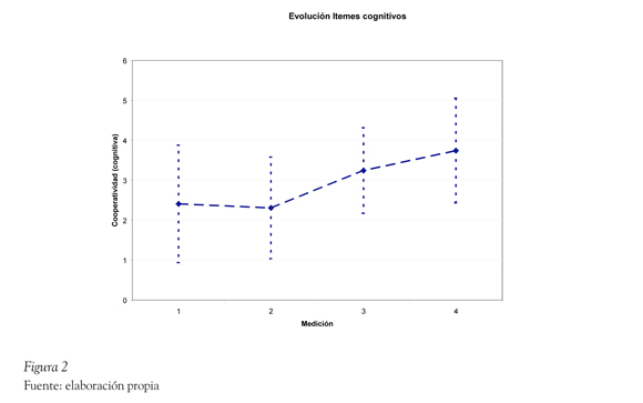 En los ítems afectivos puede observarse un patrón de aumento de la cooperatividad desde la medición uno a la medición tres, con una caída en la medición cuatro. Respecto a los ítems cognitivos hay un descenso en la medición dos para luego aumentar la cooperatividad en las siguientes mediciones. Se detecta un patrón ascendente en los puntajes, pese a que la evolución difiere, como se puede apreciar en los siguientes gráficos (ver Figuras 1 y 2).
