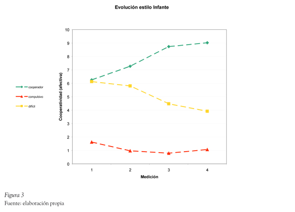 Al analizar los efectos específicos dentro del estilo de interacción se puede determinar que los cambios significativos se dan en el aumento del estilo cooperativo (F(3,66)=9.163, p=0.000) en que el cambio es lineal (F(1,22)=17.585, p=0.000). Los estilos compulsivo (F (3,66) =2.217, p=0.094) y difícil (F(3,66)=1.428, p=0.243), por su parte, no muestran diferencias estadísticamente significativas en el tiempo.