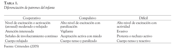 En este sentido, la sensibilidad del cuidador es un concepto diádico que puede entenderse como cualquier patrón de conducta implementado por el adulto que tranquilice al niño(a) y aumente su confort, reduciendo al mismo tiempo su angustia y desinterés. Un adulto sensible estimula al niño(a) para conseguir su atención, responde a su conducta para mantenerlo involucrado y lo calma cuando se encuentra sobre estimulado. Estas conductas deben ser contingentes al estado del niño(a) para mantenerlo en alerta y comprometido en la interacción. Así también los patrones presentados por los niños actuarían como estrategias que regulan la conducta del adulto. Estos patrones corresponden a los tipos cooperativo, compulsivo y difícil, los cuales son descritos en la Tabla 1: