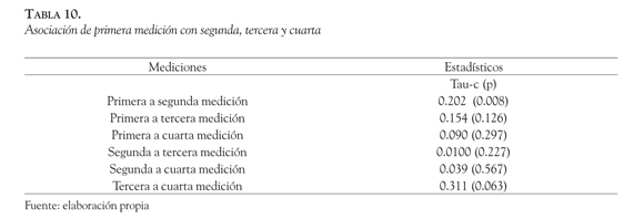 El análisis muestra que los sujetos tienden a mantenerse en la misma categoría de clasificación tanto en la primera medición como en la segunda, es decir que hay asociación pero esta no muestra cambio positivo. Sin embargo, la clasificación en la primera medición no muestra una asociación significativa con la tercera ni la cuarta medición.