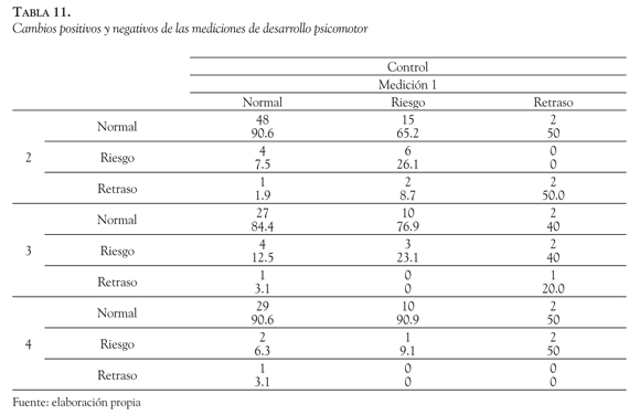 c) Análisis de la evolución del DP a través de las mediciones: Para analizar el posible impacto de la intervención sobre el DP de los niños(as) del estudio, se codificaron los puntajes obtenidos en las evaluaciones del DP en todas las mediciones en tres niveles de desarrollo: desarrollo normal, en riesgo y rezago o retraso. Se analizó el cambio en las categorías de desarrollo desde la primera medición a cada una de las mediciones siguientes. De esta forma, se puede considerar positivo cualquier cambio en el desarrollo desde una situación de rezago o riesgo a normal, o el cambio de retraso a riesgo. Por otro lado, cualquier cambio de una situación normal a riesgo o rezago, o riesgo a retraso se considera cambios negativos, mientras que la mantención en situación de normalidad, rezago, o de riesgo se considera no cambio.