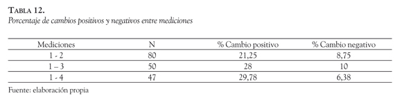 De acuerdo a esta clasificación a continuación podemos ver el porcentaje de cambio positivo y negativo en las mediciones (ver Tabla 12)