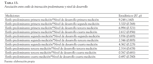 Por último, para determinar la asociación entre los estilos de interacción y el nivel de DP de los infantes se categorizó a los niños(as) según su estilo de interacción predominante. El análisis muestra que no existe asociación entre el estilo de interacción predominante y el nivel de DP del niño(a) en ninguna de las mediciones (ver Tabla 13).