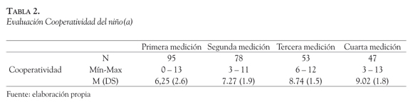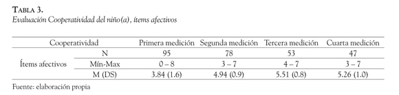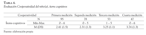El patrón de evolución de la respuesta de cooperación del niño(a) frente a la educadora es un aumento progresivo de puntajes entre la primera y la cuarta medición. Analizando cada uno de los ítems por separado podemos ver los siguientes resultados (Tabla 3):