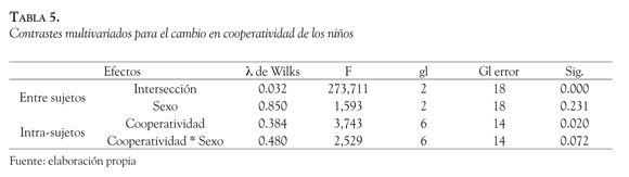 Los resultados obtenidos al analizar el cambio global de los indicadores cooperatividad de los niños se muestra en la Tabla 5.