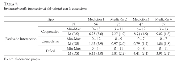 b) Análisis del estilo interaccional del niño(a) con el PE: Al analizar el estilo general de interacción entre el infante y la educadora de la SC, se observa un aumento consistente de los puntajes del estilo cooperador y una disminución estable del estilo difícil. El estilo compulsivo disminuye durante las primeras tres mediciones y aumenta levemente en la cuarta (ver Tabla 7 y Figura 3).