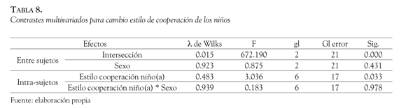 Se observa que no existen efectos significativos inter-sujetos. Esto quiere decir que no se encuentran diferencias significativas en las dimensiones de cooperatividad al comparar entre niños y niñas (λ de Wilks=0.850, F=1,593, gl=2 y 18, p=0.231). El análisis de los efectos intra-sujetos, en cambio muestra efectos significativos para el factor coo-peratividad (k de Wilks=0.384, F=3,743, gl=6 y 14, p=0.020). Dado que el factor cooperatividad es la medida del cambio en el tiempo de los ítems que miden cooperatividad, esto quiere decir que se detecta un cambio estadísticamente significativo en la cooperatividad presentada por los niños entre las mediciones uno y cuatro.