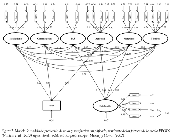 En el modelo 3, la varianza explicada por los predictores de valor ascendió a un 34%. Para la satisfacción, la varianza explicada por este modelo representó un 46.6%. Este modelo presentó unos indicadores de ajuste ligeramente mejores a los modelos precedentes (Tabla 1).