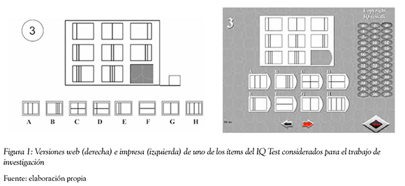 IQ Test: Cuenta con 39 ítems y un tiempo de administración de 40 minutos. Cada ejercicio presenta la estructura que indica la Figura 1 a la izquierda: al centro se presenta una estructura con 9 recuadros, en donde el recuadro final de la serie está vacío y debe ser completado con alguna de las 8 alternativas propuestas en la parte baja del mismo. Para el proceso de aplicación colectiva, se generó una versión impresa en la que se enumeró cada ejercicio y las alternativas propuestas se dispusieron en una sola fila abajo de la estructura para poder presentar varios ejercicios en una misma hoja. Se presentan ambos formatos, virtual e impreso respectivamente, en la Figura 1.