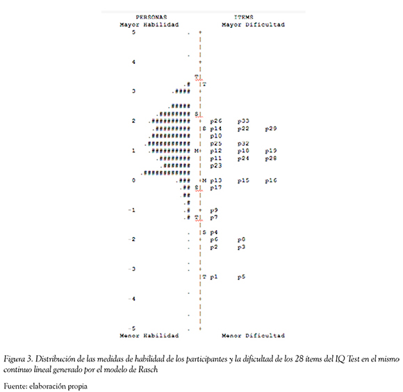 La Figura 3 permite observar gráficamente la distribución de las medidas de habilidad de los participantes y la dificultad de los 28 ítems resultantes del IQ Test en el mismo continuo lineal generado por el modelo de Rasch. A la izquierda de la línea vertical se presentan los resultados de los participantes. En la parte superior se localizan los participantes con mayores niveles de habilidad. En la parte inferior se localizan los participantes con menor nivel de habilidad. A la derecha de la línea vertical se presentan los resultados de los ítems. Los ítems con mayor nivel de dificultad se localizan en la parte superior. Los ítems con menor nivel de dificultad se localizan en la parte inferior. Al comparar el promedio en la escala logits del modelo de Rasch obtenido por la muestra de participantes (M = 1.05, EE = 0.53) y por los ítems del test (M = 0.00, EE = 0.05), se observa que la mayoría de los participantes están localizados sobre el valor 0.00 en la escala logits.