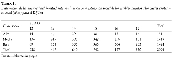 Luego de la etapa piloto se procedió a seleccionar una muestra definitiva de proporción estratificada por nivel educativo. En Chile hay evidencia que indica que el grupo de extracción social (alta, media y baja) es homologable al tipo de dependencia administrativa de los establecimientos en el sistema educativo (particular, subvencionada y municipalizada, respectivamente) García-Huidobro y Bellei (2003). La muestra definitiva se definió en base a criterios de nivel educativo, género y edad de los alumnos a lo largo del país, de acuerdo a lo que muestra la Tabla 1. Adicionalmente se decidió considerar en la aplicación del instrumento un grupo adicional (separado) de estudiantes destacados en matemáticas, a los cuales también se les aplicó el test. Este grupo de estudiantes considerados destacados en matemáticas correspondió al grupo de estudiantes que participan en la competencia "Campeonato Regional Escolar de Matemáticas, CEMAT".