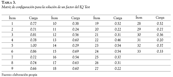Para verificar el supuesto de unidimensonalidad se sometieron 33 de los ítems del IQ Test que permanecieron después de la aplicación piloto, a un análisis