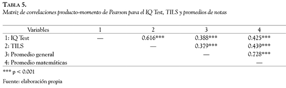 La validez de criterio se analizó mediante el estudio de las correlaciones producto-momento de Pearson entre las puntuaciones del test y las variables de criterio: promedios de notas general y promedio de notas en matemática, también respecto al puntaje alcanzado por los mismos estudiantes en el TILS que se aplicó previamente a la misma población escolar y que está validado y estandarizado en Chile (Cerda et al., 2011). Como se observa en la Tabla 5, las correlaciones permiten avalar la validez de criterio (rendimiento académico) y también la validez concurrente (inteligencia lógica) del IQ Test. El análisis previo de los gráficos de dispersión permitió constatar la inexistencia de relaciones no-lineales entre las variables, así como la ausencia de valores atípicos influyentes.