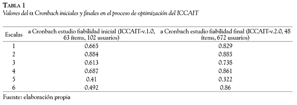 El ICCAIT-v.2.0 es el cuestionario resultante de la optimización de una primera versión del mismo (ICCAIT-v.1.0), de Romero-Galisteo (2011), en el que se realizó un estudio piloto inicial con 102 participantes y que estaba compuesto por 6 escalas y un total de 63 ítems. Los resultados mostraron una buena fiabilidad en todas las escalas salvo en la 5, siguiendo el rango establecido por Nunnally (1978). Dicho instrumento muestra una fiabilidad, estimada mediante el coeficiente a de Cronbach, entre 0.41 y 0.884. Posteriormente, esta investigación fue ampliada, aumentando tanto la muestra (pasando de N = 102 a N = 672) como el número de centros participantes (inicialmente fueron 3 que posteriormente se ampliaron a 15), con lo que se obtuvo una segunda versión de la herramienta que resultó más pragmática y consiguió mejorar sus propiedades psicométricas. Esta segunda versión, además de estar diseñada y validada específicamente en el contexto de la AT, cuenta con una fiabilidad estimada entre 0.322 y 0.885, como puede observarse en la Tabla 1.