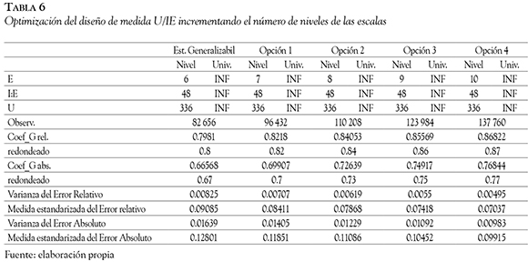En la Tabla 5, se presenta un diseño en el que se pretende optimizar la faceta U. En el presente estudio, se partió de 336 valores del criterio U, la mitad del total de la muestra, lo que comporta un total de 82 656 observaciones y supone unos coeficientes tanto de generalizabilidad como de fiabilidad de 0.99. Los resultados obtenidos implementando 340, 350 y 360 valores de U (aumentando con ello el número de observaciones a 83 640, 86 100 y 88 560, respectivamente) ofrecen igualmente excelentes coeficientes de generalizabilidad.